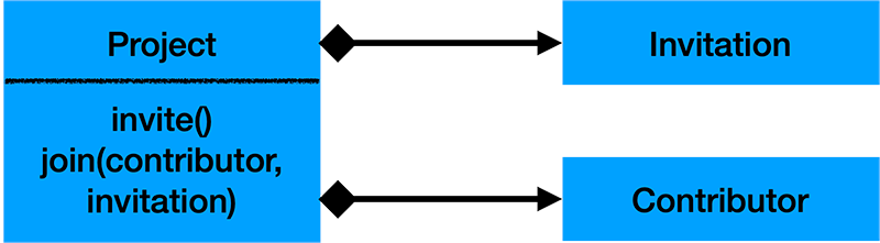 As we see from the Diagram, a Project entity might contain multiple Invitations and multiple Contributors. There are two methods to generate a new Invitation and add a Contributor to the project.